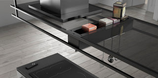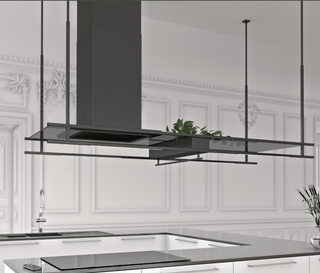 Available in either 140cm or 180cm sizing, and finished matte black with dark glass panels, the Frame is the ideal island cooker hood for a traditional/industrial kitchen space. The open tray/shelf in its centre allows for storage space for items such as condiments. Its modular accessories (sold separately) also give it functionality with optional wine racks, utensil hooks, and even a phone/tablet holder. The Frame also features four 4.1W LED lights for a brilliant white illumination onto the workspace below.